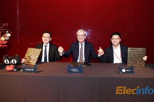 天貓平臺事業(yè)部總經理劉博(左),大英博物館理事會主席Sir Richard Lambert及品源文華CEO何一贊(右)