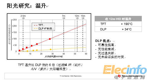 模擬峰值太陽(yáng)輻照度只是預(yù)測(cè)和避免熱失效的第一步。太陽(yáng)能根據(jù)其所射入材料的光譜吸收轉(zhuǎn)換為熱量。例如,在我們的測(cè)試中,如圖3所示,由于陽(yáng)光負(fù)載導(dǎo)致的薄膜晶體管(TFT)面板的溫升比基于DLP技術(shù)的系統(tǒng)中所用的透射式微透鏡陣列散射屏快6倍,從而使TFT面板更易受到太陽(yáng)輻照度的損害。