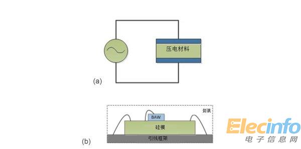 圖1:壓電材料用作諧振器(a); TI BAW技術(shù)集成于硅片之上(b)
