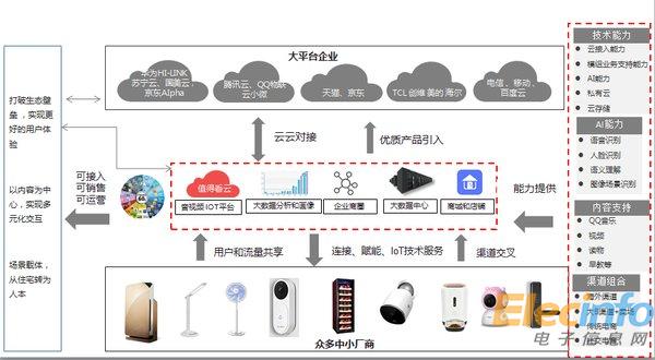 首先從上游來講,理想的智能家居產(chǎn)業(yè)是打破不同生態(tài)間的壁壘,產(chǎn)品互聯(lián),協(xié)議互通,達到消費者的無感知體驗,和國內(nèi)外主流物聯(lián)網(wǎng)平臺對接,混合各大云服務(wù)商優(yōu)勢,滿足客戶同時接入多平臺需求,目前值得看云已和騰訊云、華為、蘇寧、移動等生態(tài)企業(yè)達成深度戰(zhàn)略合作,實現(xiàn)云云對接,協(xié)同共享。