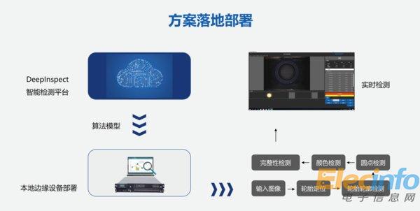 具體的檢測方式為:先將產(chǎn)品的缺陷通過圖像抓取出來,然后將對圖像數(shù)據(jù)的標(biāo)注錄入系統(tǒng),使檢測平臺(tái)Deep Inspect利用數(shù)據(jù)信息訓(xùn)練算法模型,通過邊采集數(shù)據(jù)邊更新模型的方式,在模型達(dá)到一定的準(zhǔn)確精度后,再安裝到產(chǎn)線上取代人工質(zhì)檢的工作。