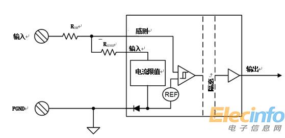隔離數(shù)字輸入充當(dāng)提供從傳感器輸入或其他輸入類型到主機(jī)控制器接口的邏輯輸出的電流隔離的基本功能。與數(shù)字隔離器不同,隔離數(shù)字輸入的輸入級(如圖2所示)包括用戶設(shè)置輸入閾值和集成電流限制,允許9V至60V范圍內(nèi)的輸入電壓轉(zhuǎn)換為邏輯輸出。在最簡單的形式中,隔離數(shù)字輸入用作隔離比較器,具有一些易于設(shè)計的附加功能。