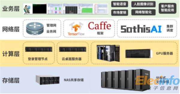 針對不同深度學習場景,可以搭載多顆GPU的不同類型GPU服務器,在整個計算層中成為了的核心計算單元。同時,在計算層中針對集群管理和桌面服務等非核心計算部分采用通用機架服務器支撐。