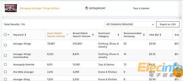 比如,想賣(mài) "Stranger Things Dungeons & Dragons set" 這個(gè)桌游卡牌,輸入競(jìng)品的ASIN(B076QMGGKF),可以看到一共有114個(gè)相關(guān)關(guān)鍵詞。其中搜索量排名第一的 "stranger things" 是個(gè)短尾詞,它的競(jìng)價(jià)是$3.58。排名第三的關(guān)鍵詞monopoly fortnite精確搜索量大(8151次)且競(jìng)價(jià)低($0.10), 值得添加到My Lists(自己的關(guān)鍵詞列表)里。