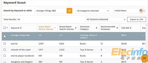 跟競(jìng)品用的關(guān)鍵詞 "Stranger Things" 相比,這個(gè)方法搜出來(lái)的關(guān)鍵詞 "dnd 5e" 的競(jìng)價(jià)低很多($0.60),CPC下降,轉(zhuǎn)化率也能提升很多!只要繼續(xù)在Keyword Scout返回的列表上找到至少25個(gè)類(lèi)似的長(zhǎng)尾詞,來(lái)彌補(bǔ)它們單個(gè)搜索量上的不足就可以了。值得一提的是,Keyword Scout的關(guān)鍵詞搜索量數(shù)據(jù)(Search Volume)不是“預(yù)測(cè)”數(shù)值,而是直接從亞馬遜平臺(tái)獲得的精準(zhǔn)數(shù)據(jù),非常有價(jià)值。
