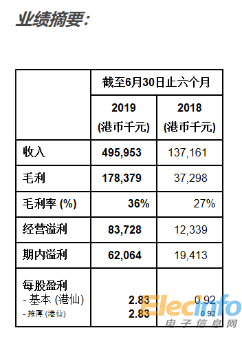 本集團收入由截至2018年6月30日止六個月的約港幣137.2百萬元增加約262%至截至2019年6月30日止六個月的約港幣496.0百萬元。本集團毛利由2018年6月30日止六個月約港幣37.3百萬元增加約378%至2019年6月30日止六個月的港幣178.4百萬元。毛利率大幅攀升9個百分點至36%。經營溢利率也從2018年6月30日止六個月止的9%,大升7.9個點至2019年同期的16.9%。每股盈利增加2 倍至2.83港仙(2018年同期0.92港仙)。