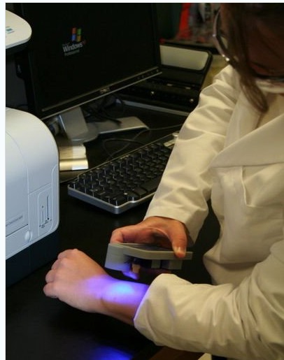 生物工程學(xué)系博士生凱特·巴拉科尼斯使用iPhone閱讀器照射自己的手臂。