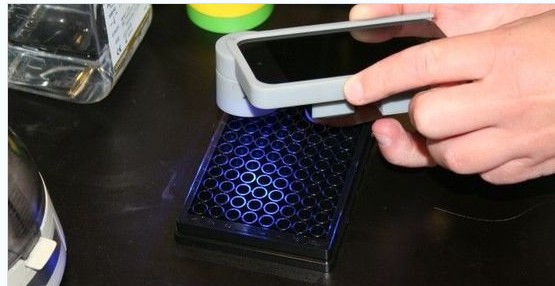 研究人員使用孔板閱讀儀測(cè)試iPhone附加裝置,孔板閱讀儀能夠測(cè)定納米顆粒對(duì)閱讀器的反應(yīng)。