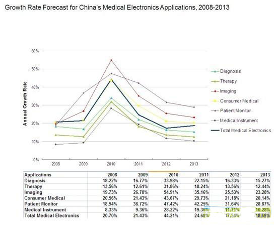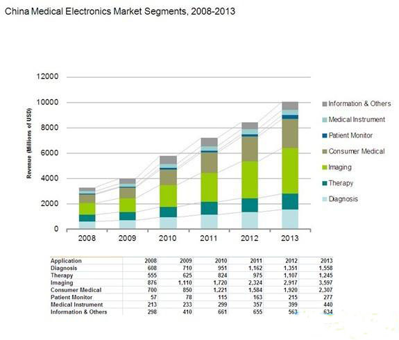 在細分應(yīng)用領(lǐng)域中,影像設(shè)備仍占最大市場份額,其次是消費類醫(yī)療設(shè)備。預(yù)計2011年,這兩大領(lǐng)域的市場額分別以35%、30%的增長率高速成長,成長最快的為監(jiān)護設(shè)備,將以42%的增長率成長。