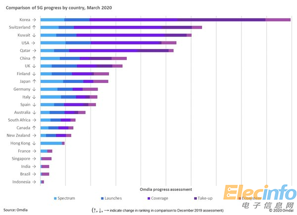 全球 調(diào)查公司 OMDIA 發(fā)布了《2020年3月全球5G進(jìn)展更新》 第二版 報(bào)告。 OMDIA 分析了 22 個(gè)國(guó)家的 5G 技 術(shù)部署情況,而該報(bào)告顯示其中韓國(guó)在 5G 部署 領(lǐng)域排名第一。