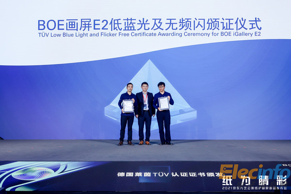 4月22日,“紙為睛彩”2021京東方藝云類紙護(hù)眼屏新品發(fā)布會在北京召開,德國萊茵TUV大中華區(qū)出席本次活動,為BOE畫屏E2頒發(fā)了低藍(lán)光以及無頻閃認(rèn)證證書。