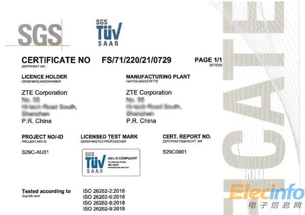 中興通訊獲頒SGS ISO 26262:2018汽車功能安全流程認(rèn)證證書