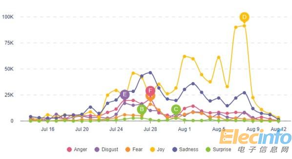 在傳統(tǒng)的情感(sentiment)分類基礎(chǔ)上,CSL提供獨(dú)特的情緒(emotion)解讀,進(jìn)一步提高了語(yǔ)義分析的準(zhǔn)確度,幫助品牌識(shí)別傳統(tǒng)方法無(wú)法捕獲的對(duì)話中表達(dá)的真實(shí)含義,了解社交媒體上的喜怒哀樂(lè)。下圖展示了利用CSL觀察到的奧運(yùn)期間海外網(wǎng)民的情緒變化歷程。