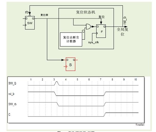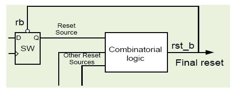 在上圖中,當(dāng)復(fù)位源SW_Q斷言時,會導(dǎo)致rst_b斷言,這是全局復(fù)位?,F(xiàn)在,如果全局復(fù)位本身被用于清除 “SW_Q” 復(fù)位斷言,那么會在設(shè)計中在SW_Q輸出和全局復(fù)位時產(chǎn)生干擾。此外,在模擬中,這會導(dǎo)致紊亂情況,因為復(fù)位源斷言試圖通過該組合邏輯去斷言。