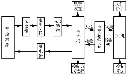 如圖1 所示,被控對象通過傳感器的作用,采集到相應(yīng)的數(shù)據(jù),經(jīng)過電壓轉(zhuǎn)換以及模擬/數(shù)字轉(zhuǎn)換之后,向單片機發(fā)送,單片機端可以根據(jù)數(shù)據(jù)采集的情況以及預(yù)先設(shè)置的程序,經(jīng)過繼電器向被控制對象進行具體的操作,同時也可以通過電平轉(zhuǎn)換芯片向PC 機發(fā)送采集到的數(shù)據(jù)。PC 機可以對采集的數(shù)據(jù)進行存儲、處理,也可以根據(jù)這些數(shù)據(jù)來完善控制算法,然后經(jīng)過電平轉(zhuǎn)換芯片發(fā)送控制信號,遠程控制被控對象。