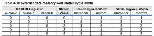 通過設(shè)置CKCON的第0-2位,可以改變EMIF總線的memrd,memwr,memaddr的寬度,最小值是000,對應(yīng)memrd,memwr,memaddr的寬度為1個時鐘周期;當(dāng)設(shè)置為111時,對應(yīng)memrd,memwr,memaddr的寬度為8個時鐘周期;所以推薦客戶在CPU開始運行就改變4-6位的值為000,以使EMIF總線訪問的效率最快。
