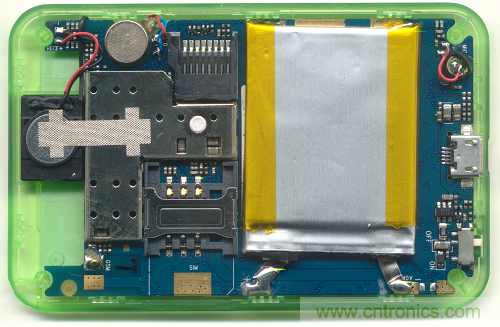 這款手機內(nèi)部沒有使用螺絲,各組件是咬合在一起的,基本沒有連接器,從顯示屏到電池,所有都是直接焊接到電路板上,電池也沒有二次保護(hù)電路。最主要的兩個集成電路芯片是聯(lián)發(fā)科MT6250DA和Vanchip VC5276。