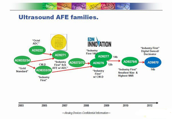 “我們在超聲領(lǐng)域提供的是線性的解決方案,AD8332/34是我們03年推出的,這也是一款金牌產(chǎn)品,而AD9271是業(yè)內(nèi)第一個8通道模擬前端,今年7月份,我們又推出了業(yè)界首款片內(nèi)集成數(shù)字I/Q解調(diào)器和抽取濾波器的8通道超聲接收器AD9670?!?