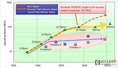 下圖為瑞薩電子MCU發(fā)展時(shí)間-閃存讀取速度圖:可以看到,到2010年,瑞薩MCU芯片大小為40納米,響應(yīng)頻率大大超過(guò)100MHz(紅色虛線)。而傳統(tǒng)MCU芯片供應(yīng)商(藍(lán)色實(shí)線)產(chǎn)品的閃存讀取頻率仍低于40MHz,很大程度上限制了芯片的性能發(fā)揮。