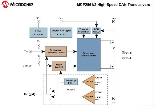 全新系列MCP2561/2收發(fā)器提供了兩種器件選項(xiàng)。MCP2561是一款采用8引腳封裝的高速CAN收發(fā)器,并設(shè)有一個(gè)SPLIT引腳。SPLIT引腳有助于以偏置抽頭式端接方案穩(wěn)定共模。MCP2562也是一款采用8引腳封裝的高速CAN收發(fā)器,并設(shè)有一個(gè)Vio引腳。Vio引腳可以連接輔助電源,以便在內(nèi)部對(duì)CAN收發(fā)器的數(shù)字I/O進(jìn)行電平調(diào)節(jié),從而便于與單片機(jī)的連接。這對(duì)使用小于5V(例如1.8V或3.3V)Vdd的單片機(jī)系統(tǒng)非常有利,而且消除了對(duì)外部電平轉(zhuǎn)換器的需求,降低了系統(tǒng)成本及復(fù)雜性。