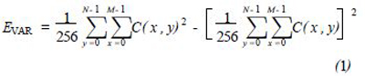 設(shè)參考宏塊的像素值(Y分量值,以下同)用P(x,y)表示,當(dāng)前宏塊的像素值用C(x,y)表示,x,y表示宏塊的縱、橫坐標(biāo),M,N表示宏塊的寬和高。當(dāng)前宏塊像素值的方差用EVAR表示,其值為
