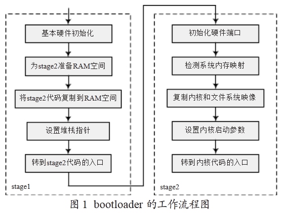 第二步常用C語言來實(shí)現(xiàn)。即:初始化本階段要使用到的硬件設(shè)備;檢測系統(tǒng)內(nèi)存映射(memory map);將kernel映像和根文件系統(tǒng)映像從flash上讀到ram空間中;為內(nèi)核設(shè)置啟動(dòng)參數(shù);調(diào)用內(nèi)核。圖1所示是bootloader的工作流程圖。