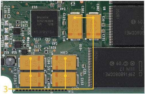 2.系統(tǒng)存儲(chǔ)控制器使用了一個(gè)512Mb的海力士H55S5162EFR移動(dòng)SDRAM。Intel使用移動(dòng)SDRAM的決定是很有意義的,因?yàn)樗芴峁┮蟮男阅艿燃?jí),同時(shí)又能最大限度地降低功耗。這里降低功耗很重要,因?yàn)樵谟脖P工作時(shí)DRAM具有很大的處理工作量,特別是在企業(yè)級(jí)應(yīng)用中。