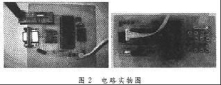 對(duì)應(yīng)于上述框圖的電路實(shí)物圖如圖2所示。其左右兩個(gè)電路分別對(duì)應(yīng)上述框圖中的左右兩個(gè)部分??傮w來說,它包括電平轉(zhuǎn)換電路、單片機(jī)處理部分、無線收發(fā)部分(CCll00收發(fā)器)、液晶顯示模塊和鍵盤輸入模塊五個(gè)部分。