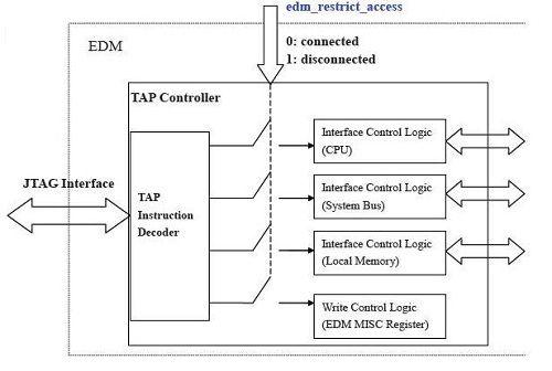 EDM安全存取是AndesCore 內(nèi)建的功能(option),應(yīng)用在安全存取的控管。EDM安全存取有二種的控管方式:debug access indication和EDM access restriction.第一種控管方式(debug access indication)提供了一個sideband signal用于指示從調(diào)試器(Debug host)的請求。第二種控管方式, 控制AndesCore的input port(edm_restrict_access )達到EDM存取的限制。更詳細的內(nèi)容在后續(xù)章節(jié)會有更深入的介紹。