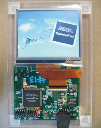 LCD正在迅速成為汽車內(nèi)的標準部件。隨著LCD技術(shù)的發(fā)展,迫切需要采用更好的顯示圖形內(nèi)容控制和產(chǎn)生方法。傳統(tǒng)上,低成本汽車信息娛樂應(yīng)用采用基于字符的LCD和真空熒光(VF)顯示屏,而低成本彩色薄膜晶體管(TFT)技術(shù)很快成為最突出的選擇方案,但在現(xiàn)有的低成本應(yīng)用體系結(jié)構(gòu)中采用彩色TFT有很大的難度。大部分低成本平臺沒有足夠的處理帶寬,特別是缺少帶有LCD控制器的處理器來控制并驅(qū)動彩色TFT LCD。此外,大部分現(xiàn)有的體系結(jié)構(gòu)并沒有足夠的動態(tài)和非易失存儲器來存儲LCD需要的圖形內(nèi)容。更復(fù)雜的設(shè)計問題是產(chǎn)生并管理圖形內(nèi)容或者圖形用戶界面(GUI)時低效的設(shè)計過程,而現(xiàn)在可以通過彩色TFT LCD來解決這些問題。一般而言,如果沒有合適的設(shè)計資源,很難在硬件上實現(xiàn)LED背光驅(qū)動器、觸摸面板控制以及TFT控制所需要的大量I/O,現(xiàn)在這些難題有了解決方法,即,名為Thomas II電路板(圖1)的模塊化擴展平臺,它含有低成本Altera Cyclone III FPGA和Nios II嵌入式處理器。使用這一平臺,汽車電子設(shè)計人員很容易在現(xiàn)有系統(tǒng)體系結(jié)構(gòu)中加入彩色TFT,開發(fā)低成本智能顯示模塊。
