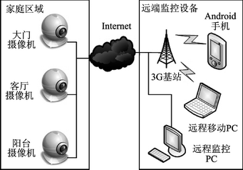 網(wǎng)絡(luò)攝像機(jī)是互聯(lián)網(wǎng)上的TCP/IP設(shè)備,系統(tǒng)網(wǎng)絡(luò)拓?fù)鋱D如圖2所示。其中在家庭區(qū)域內(nèi)根據(jù)安防的特點在大門走廊、客廳內(nèi)、陽臺區(qū)域分別布置攝像機(jī),再由網(wǎng)線連接到路由器,配置路由器參數(shù)映射每個攝像機(jī)獨立端口與IP地址,即完成Internet接入。遠(yuǎn)端由固定位置的PC機(jī),移動位置的3G筆記本和隨身攜帶的3G Android手機(jī)組成,PC機(jī)可以通過WEB瀏覽器訪問與控制網(wǎng)絡(luò)攝像機(jī),Android手機(jī)通過客戶端實現(xiàn)實時訪問。