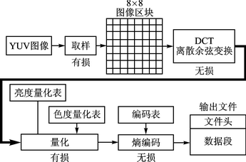 人眼視覺生理特性決定眼睛對構(gòu)成圖像的不同頻率成分具有不同的敏感度。JPEG壓縮是有損壓縮[3],但損失的部分是人類視覺不容易察覺到的部分,利用眼睛對色彩域中的高頻信息部分不敏感的特點,節(jié)省大量需要處理的數(shù)據(jù)信息。一幀原始圖像數(shù)據(jù)對其進(jìn)行JPEG算法編碼過程分兩大部分: