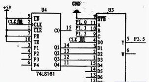 74LS161為二進制同步計數(shù)器,具有同步預置數(shù)、異步清零以及保持等功能。合理應用計數(shù)器的清零功能和置數(shù)功能,一片74LS161可以組成16進制以下的任意進制分頻器;74LS151是具有選通輸入端,互補輸出的8選1數(shù)據(jù)選擇器,數(shù)據(jù)選擇端(ABC)按二進制譯碼,以從8個數(shù)據(jù)(D0~D7)中選取1個所需的數(shù)據(jù)。