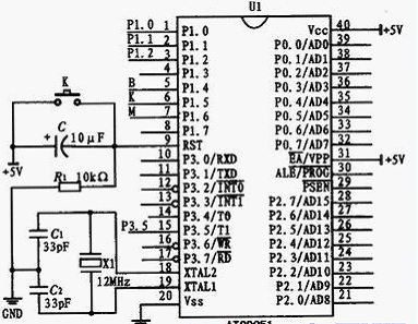 單片機系統(tǒng)的拓展通常是以最小系統(tǒng)為基礎的。信號處理模塊主要是依靠單片機的最小系統(tǒng)。最小系統(tǒng)是一個真實有用的單片機最小配置系統(tǒng)。對于AT89C51單片機而言,因為片內(nèi)帶有程序存儲器,所以只要在芯片上外接復位電路和晶振電路就構成了最小系統(tǒng)。單片機的XTAL1和XTAL2引腳是用來連接晶振電路的,XTAL1接外部晶振和微調(diào)電容的一端,它是內(nèi)部時鐘工作電路及振蕩器的反向放大器的輸入端;XTAL2接外部晶振和微調(diào)電容的器一端,在片內(nèi)它是振蕩器的反向放大器的輸出端。RST為單片機的復位端,接復位電路,該引腳為高電平時可使單片機復位,回到初始狀態(tài)。復位電路主要包括復位開關、復位電阻和復位電容。單片機的最小系統(tǒng)如圖4所示。