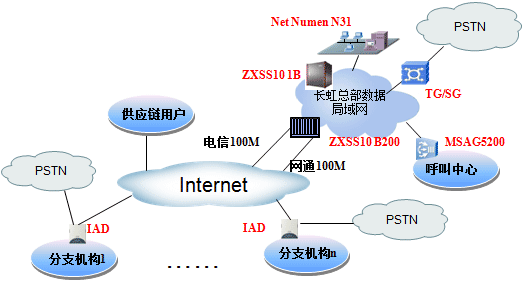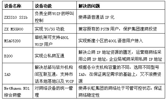 考慮到現(xiàn)網(wǎng)情況,及實際需求,中興通訊為四川長虹公司內(nèi)部提供一套軟交換系統(tǒng)實現(xiàn)內(nèi)部的VOIP功能,同時具備多媒體通信及寬帶接入能力。