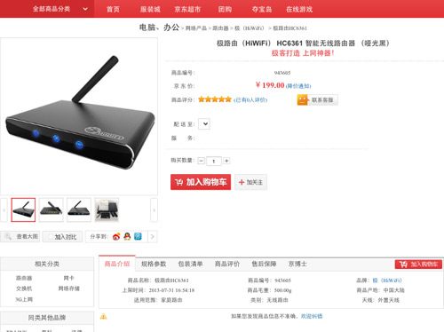 8月12日,極路由產(chǎn)品在京東商城開(kāi)賣(mài)。這個(gè)被稱(chēng)為“京東特供版”的極路由售價(jià)為199元,比其官網(wǎng)國(guó)際版的269元售價(jià)要便宜70元。區(qū)別在于,京東特供版不具備國(guó)際加速功能。