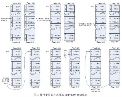 圖三介紹了使用子頁的方式實現(xiàn)Flash 模擬EEPROM的數(shù)據(jù)處理方法。
