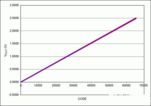 圖3. DAC輸出與輸入碼之間的關(guān)系圖,顯示了增益、失調(diào)誤差的影響,基準(zhǔn)電壓為2.5V。