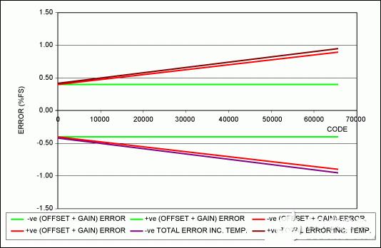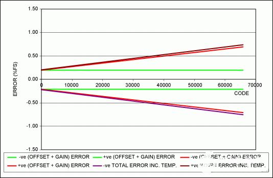 從圖中可以看出,溫度的影響遠(yuǎn)低于初始誤差,所以,即使數(shù)據(jù)手冊只給出了溫度特性的典型值,也不會對整體誤差產(chǎn)生顯著影響。零碼處的整體誤差為±0.423%FS (±10.6mV),最大輸入碼處的整體誤差為±0.952%FS (±23.8mV)。