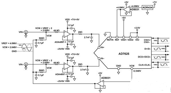 通過使用配置為單位增益緩沖器的 AD8031 來緩沖 AD7625的VCM輸出電壓(標(biāo)稱值為2.048 V),設(shè)置ADA4897-1 輸出端的共模電壓。共模偏置電壓通過590Ω串聯(lián)電阻施加于輸入端。 AD8031非常適合驅(qū)動共模電壓,因?yàn)樗哂械洼敵鲎杩?,還可在出現(xiàn)瞬態(tài)電流時(shí)進(jìn)行快速建立。