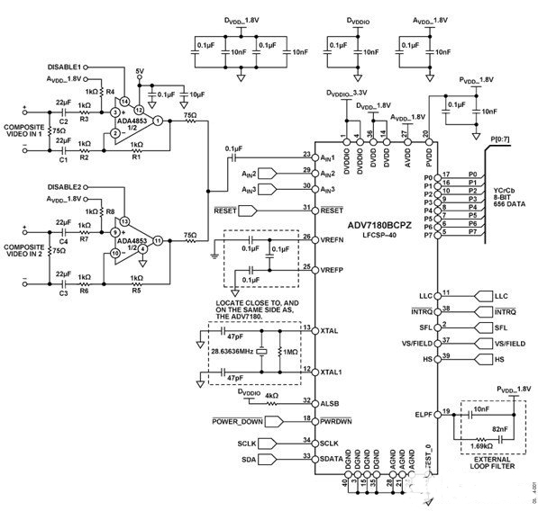 ADV7180自動(dòng)檢測(cè)與全球NSTC、PAL和SECAM標(biāo)準(zhǔn)兼容的標(biāo)準(zhǔn)模擬基帶電視信號(hào),并將其轉(zhuǎn)換為與8位ITU-R.656接口標(biāo)準(zhǔn)兼容的4:2:2分量視頻數(shù)據(jù)。