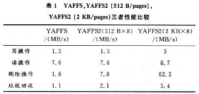 YAFFS文件系統(tǒng)已發(fā)展為兩個(gè)版本,YAFFS和YAFFS2。YAFFS版本只支持512 B的小頁NANDFLASH。而YAFFS2作為YAFFS的升級(jí)版,在向下兼容小頁NAND FLASH的同時(shí)也能夠更好地支持2 KB的大頁NAND FLASH。YAFFS2的性能與YAFFS相比有很大提高,表1為YAFFS,YAFFS2(512 B×8),YAFFS2(2 KB×8)三者性能比較,從測試結(jié)果可以看出,YAFFS2和2 KB大頁NANDFLASH的結(jié)合更好地提高了存儲(chǔ)器操作效率。
