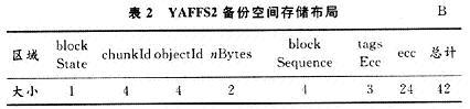 表2說明了YAFFS2文件系統(tǒng)數(shù)據(jù)在NANDFLASH的備用空間內(nèi)的存儲(chǔ)布局。