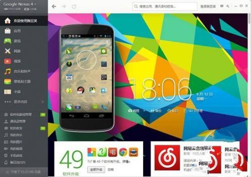 區(qū)別于管理軟件一貫單調(diào)、內(nèi)容堆疊式的設(shè)計風(fēng)格,豌豆莢的設(shè)計師對Windows新版歡迎頁首屏界面進行了顛覆性的改版:全界面背景布局簡約美觀,保留4種常用管理功能(截圖、備份、恢復(fù)、SD卡管理);沿用豌豆莢首創(chuàng)的手機機殼圖示,提升了操作過程中的互動真實感。為突出右側(cè)主屏幕的推薦,側(cè)邊欄用深色弱化,并將內(nèi)容獲取按鍵前置,體現(xiàn)了豌豆莢對內(nèi)容聚合的注重。