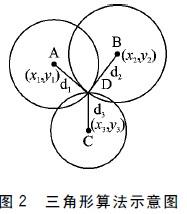 三邊定位法:分別以已知位置的3個AP為圓心,以各個到待測標簽的距離最近參考標簽的距離為半徑作圓。所得的3個圓的交點為D.三角形算法示意圖如圖2所示。