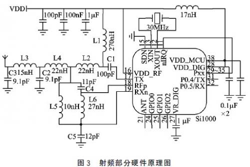 Si1000作為Si10xx系列的成員之一,在極精簡(jiǎn)的5 mm×7 mm封裝中結(jié)合了8051內(nèi)核、工作頻段為240~960 MHz高穿透力的EZRadioPRO RF收發(fā)器、64 KB的Flash和10位ADC.Si1000系列提供優(yōu)越的RF性能,具有最高輸出功率、接收靈敏度以及最低功耗的喚醒轉(zhuǎn)換等特性。該無(wú)線微控制器在工作模式下有最低的電流消耗(160μ/MHz),在休眠模式下,以內(nèi)部低頻振蕩器(LFO)作為頻率源的RTC工作時(shí),消耗電流低至315nA.在深度休眠模式下,僅需25 nA工作電流,且不會(huì)丟失RAM數(shù)據(jù)。圖3給出了射頻部分硬件原理圖。