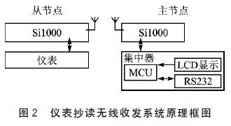 儀表抄讀無(wú)線收發(fā)系統(tǒng)原理框圖如圖2所示。無(wú)線數(shù)據(jù)的收發(fā)由無(wú)線微控制器Si1000實(shí)現(xiàn)。主節(jié)點(diǎn)Si1000內(nèi)部的發(fā)送模塊將數(shù)據(jù)進(jìn)行編碼處理,以特定的格式經(jīng)天線發(fā)送給接收模塊。從節(jié)點(diǎn)Si1000內(nèi)部的接收模塊接收到有效數(shù)據(jù)后,Si1000內(nèi)部的微處理器通過(guò)擴(kuò)展接口讀取外部?jī)x表的數(shù)據(jù),并進(jìn)行相應(yīng)的調(diào)整、轉(zhuǎn)換處理后通過(guò)射頻發(fā)送給主節(jié)點(diǎn)。主節(jié)點(diǎn)通過(guò)GPRS與集抄中心進(jìn)行通信。