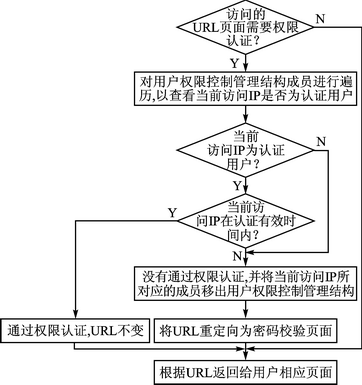 為了應(yīng)用時操作的安全性,本文將訪問的頁面分成兩類:一類為配置操作頁面,僅供認(rèn)證用戶訪問;另一類為設(shè)備狀態(tài)頁面,可供任何用戶訪問。其控制主要是通過對用戶IP的判別及訪問頁面的分類來實(shí)現(xiàn)的。首先對用戶訪問的URL進(jìn)行解析,如果訪問對象為配置操作頁面,則需要進(jìn)行認(rèn)證,在此通過一個用戶權(quán)限控制管理結(jié)構(gòu)來對通過權(quán)限認(rèn)證的用戶進(jìn)行維護(hù),并提供一個時間控制機(jī)制,使通過認(rèn)證的用戶在一定時間段內(nèi)可持續(xù)有效的對服務(wù)器進(jìn)行訪問。如果當(dāng)前客戶端(訪問者IP)在用戶權(quán)限控制結(jié)構(gòu)內(nèi),且未超時,則通過認(rèn)證,由服務(wù)器根據(jù)本次申請的URL返回相應(yīng)頁面;若超時則需要對本次訪問的URL進(jìn)行重定向,返回密碼校驗(yàn)頁面,給用戶提供密碼輸入的接口。如果訪問頁面為設(shè)備狀態(tài)頁面,則無需進(jìn)行認(rèn)證,直接由URL返回相應(yīng)頁面即可。訪問權(quán)限認(rèn)證程序流程如圖4所示。