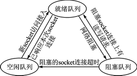 當(dāng)程序每次監(jiān)聽到新的socket連接訪問接入時,首先對空閑隊(duì)列進(jìn)行判斷,如果為空,則申請一個request結(jié)構(gòu)空間,并將其插入就緒隊(duì)列的隊(duì)頭,否則可直接將一個結(jié)構(gòu)空間從空閑隊(duì)列轉(zhuǎn)入;對當(dāng)前正在處理的就緒隊(duì)列成員,當(dāng)網(wǎng)絡(luò)阻塞時則將其移入阻塞隊(duì)列的隊(duì)頭,當(dāng)訪問結(jié)束斷開連接時,則將該成員的空間信息移入空閑隊(duì)列;而當(dāng)對阻塞隊(duì)列進(jìn)行輪詢時,根據(jù)其成員所對應(yīng)的socket上是有讀寫請求還是該連接已超時,分別將其移入就緒隊(duì)列或斷開連接移入空閑隊(duì)列。