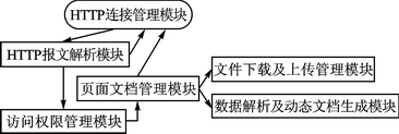 系統(tǒng)運(yùn)行時,由HTTP連接管理模塊負(fù)責(zé)對網(wǎng)絡(luò)端口進(jìn)行監(jiān)聽,當(dāng)監(jiān)聽到有連接請求到達(dá)后,即進(jìn)入HTTP報文解析模塊進(jìn)行處理,如果解析錯誤,則直接返回HTTP連接管理模塊,發(fā)出相應(yīng)的響應(yīng)報文并關(guān)閉該連接;否則,則根據(jù)對報文解析的結(jié)果,提取出本次要訪問的URL,并將其交給訪問權(quán)限管理模塊,以查看該客戶端是否具有足夠的權(quán)限;然后再轉(zhuǎn)由頁面文檔管理模塊進(jìn)行處理,根據(jù)對報文的初步解析以及對訪問權(quán)限的判斷,由頁面文檔管理模塊來決定是否調(diào)用CGI,以實(shí)現(xiàn)文件的下載上傳及響應(yīng)文檔的生成,從而將正確的響應(yīng)報文及頁面文檔轉(zhuǎn)交給HTTP連接管理模塊進(jìn)行網(wǎng)絡(luò)數(shù)據(jù)的應(yīng)答回送。